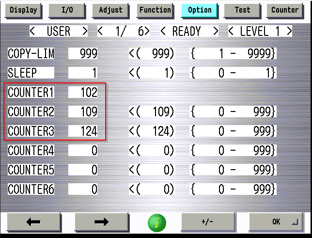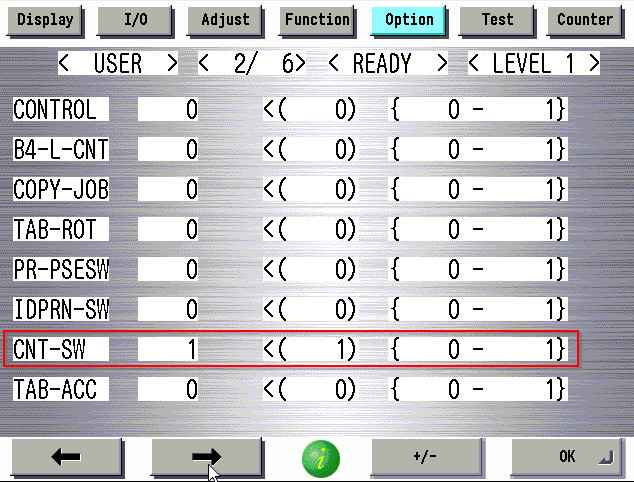 Service mode (LVL 1) COPIER>OPTION>USER>CNT-SW=”1″